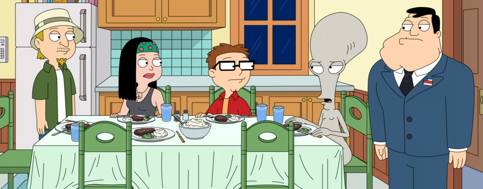 Глава семейства – Стэн Смит, сотрудник ЦРУ и закостенелый республиканец, который не готов поступиться своими принципами даже во имя родных. Он любит использовать своё положение, чтобы контролировать (во всяком случае, пытаться) жену и детей, а также – тот ещё любитель пошмалять из табельного оружия. Его жена Франсин – привлекательная блондинка, вынужденная сидеть дома и заниматься хозяйством. Все её попытки устроиться на работу или найти постоянное хобби разбиваются о неготовность Стэна делить свою жену со своими увлечениями. Несмотря на некоторую наивность, эта женщина отличается терпимостью к окружающим и добротой сердца. Сразу и не скажешь, что в юности она была той ещё оторвой. Старшую дочь четы Смитов зовут Хейли. Она студентка колледжа, которая обожает участвовать в акциях протеста и потусоваться со своими друзьями-хиппи. Хейли то и дело спорит со своим отцом, по причине диаметрально разного мировоззрения. Однако им удаётся уживаться под одной крышей. Младшего сына зовут Стив. Это подросток, чьи мечты в основном сосредоточены вокруг мыслей о том, как бы потрогать женскую грудь и лишиться девственности. Впрочем, время от времени он так же играет в ролевые игры и настолки со своими друзьями.
